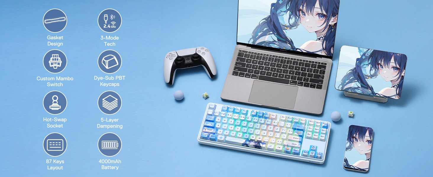 80% TKL Form Fact - K707 tenkeyless features an 87 keys layout design, cutting loose the numpad for more mouse-moving space. Original gasket structure and board material in a compact 80% layout design, crafted for FPS gamers.