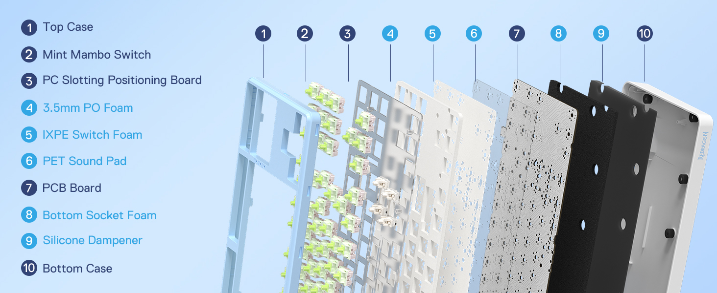 Noise Dampening x 5 - Equipped with 3.5mm PO foam, IXPE switch foam, PET sound pad, bottom socket foam, silicone bottom pad along with the silicone gasket. Significantly reduce the hollow noise, creating dampened and ultra-clean typing acoustics, making each keystroke satisfying and comfortable.