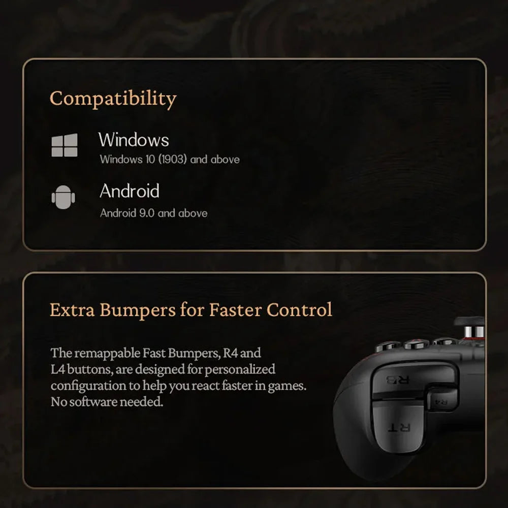 The remappable Fast Bumpers, R4 and L4 buttons, are designed for personalized configuration to help you react faster in games. No software needed.
