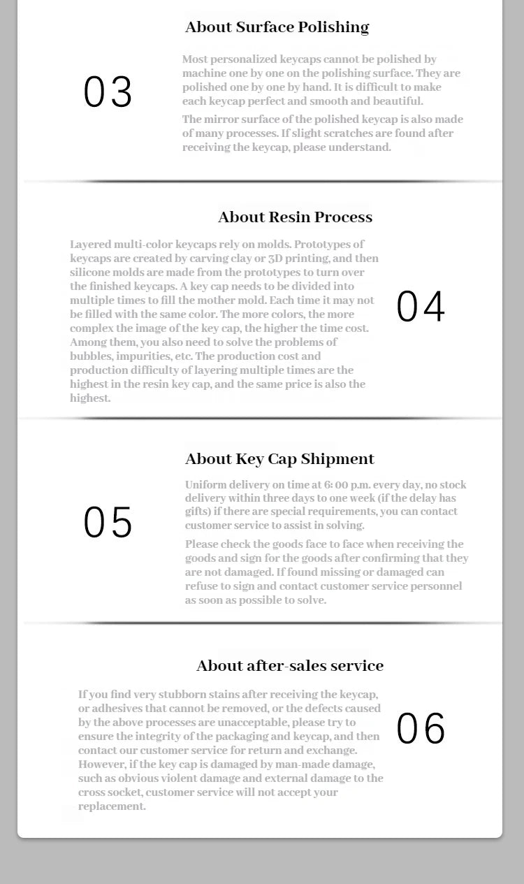 1.Most styles have no bubbles or scratches, but there may be hand marks. Hand polishing and minor defects are normal conditions, and cannot guarantee that each one is exactly the same (including but not limited to color and size), and are not considered as a condition for returning or exchanging items due to quality issues.