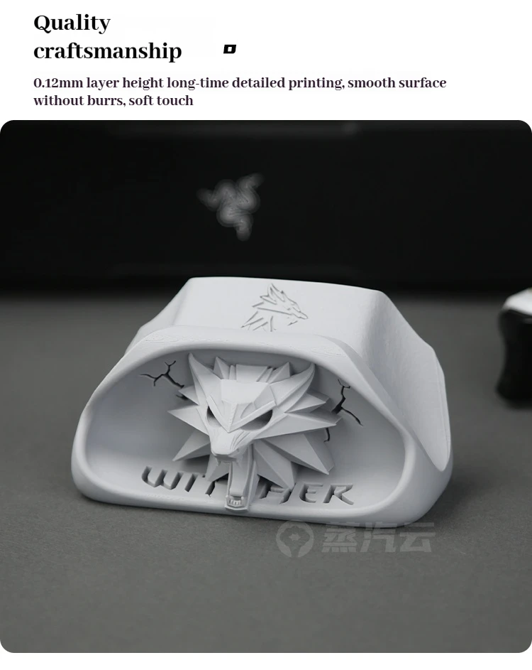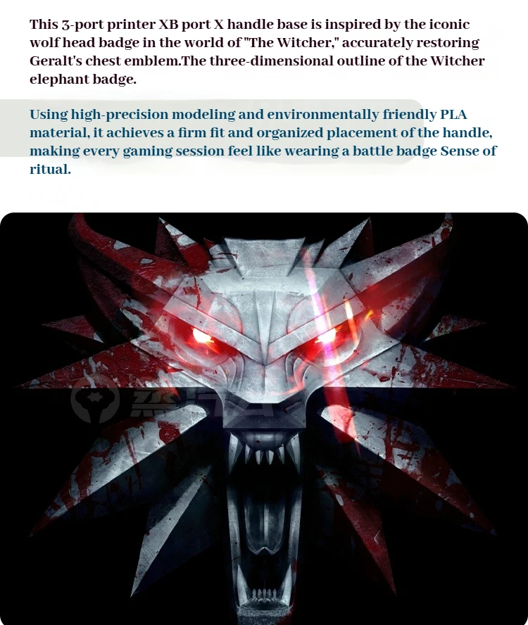 characteristic; This 3-port printed XB port X handle base is inspired by the iconic wolf head badge in the Wizarding world view, accurately reproducing the three-dimensional outline of Geralt's chest demon hunter elephant badge. Using high-precision modeling and environmentally friendly PLA material, the controller achieves stable fitting and inductive placement, making every game experience as ceremonial as wearing a battle emblem.