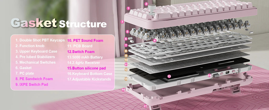 Experience a quieter and smoother typing experience with the B68 creamy keyboard's precision gasket mount structure, featuring five layers of sound-absorbing padding. The inclusion of PE sandwich foam, IXPE switch pad, PET sound foam, switch foam, and a silicone button pad ensures reduced noise and vibration. Paired with pre-lubricated mechanical switches, this creamy-sounding keyboard offers a soft and fluid typing feel, perfect for those who appreciate an ASMR keyboard experience.