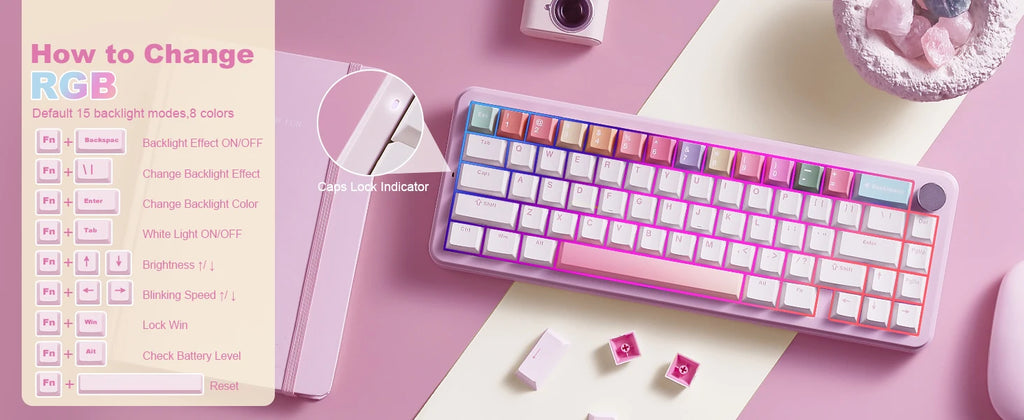 Brighten up your workspace with the B68's colorful RGB backlighting and south-facing LEDs. This rainbow keyboard also includes durable double-shot PBT keycaps, along with additional gradient rainbow keycaps, allowing you to personalize your setup to match your aesthetic keyboard style. Beyond the built-in lighting presets you can further customize the keyboard's functions and RGB settings through the software, giving you complete control over this custom keyboard.